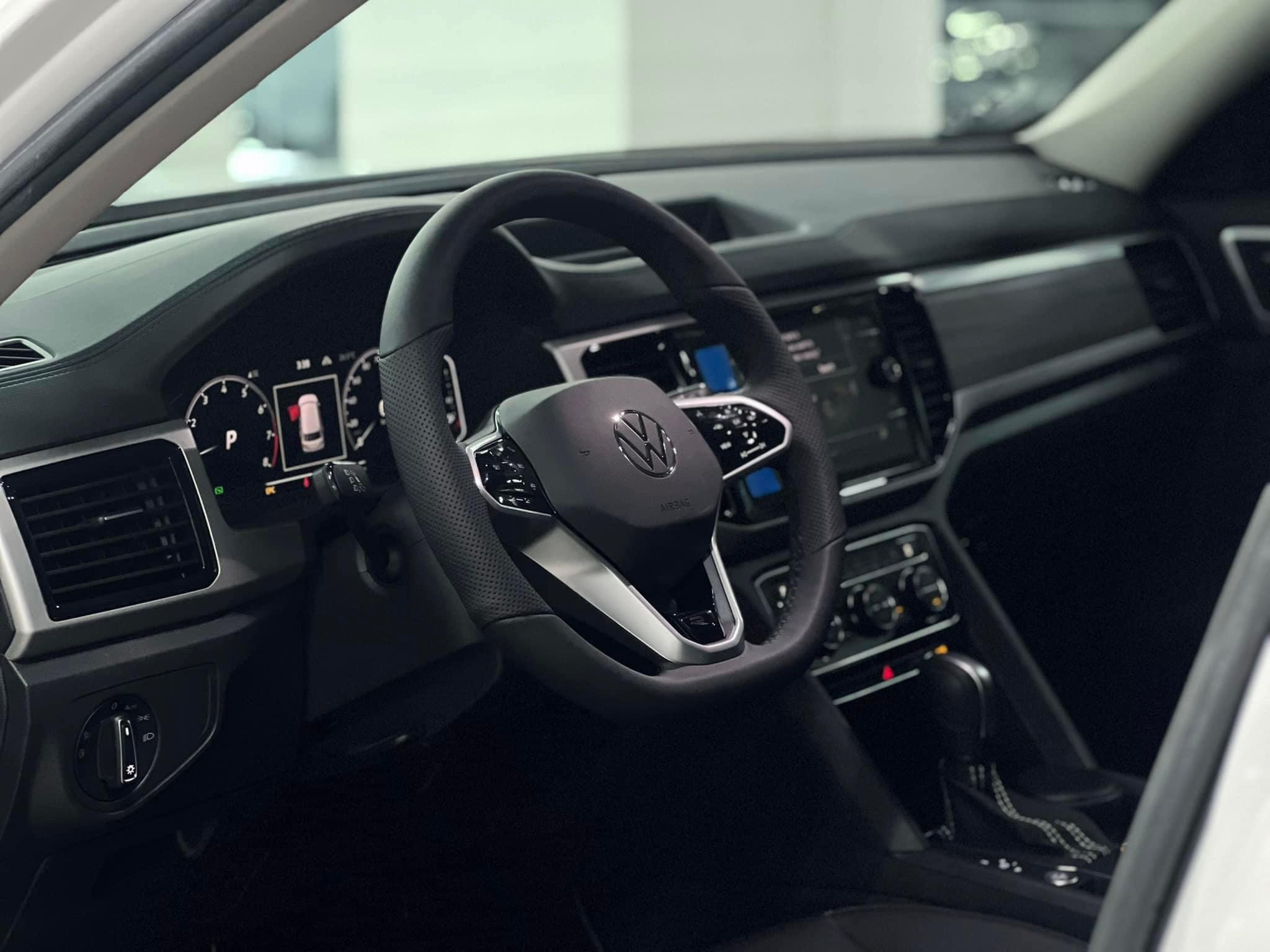 Volkswagen Teramont phiên bản nâng cấp được trang bị vô-lăng thể thao R-line bọc da Nappa và phím bấm kiểu cảm ứng với logo Volkswagen làm trung tâm.